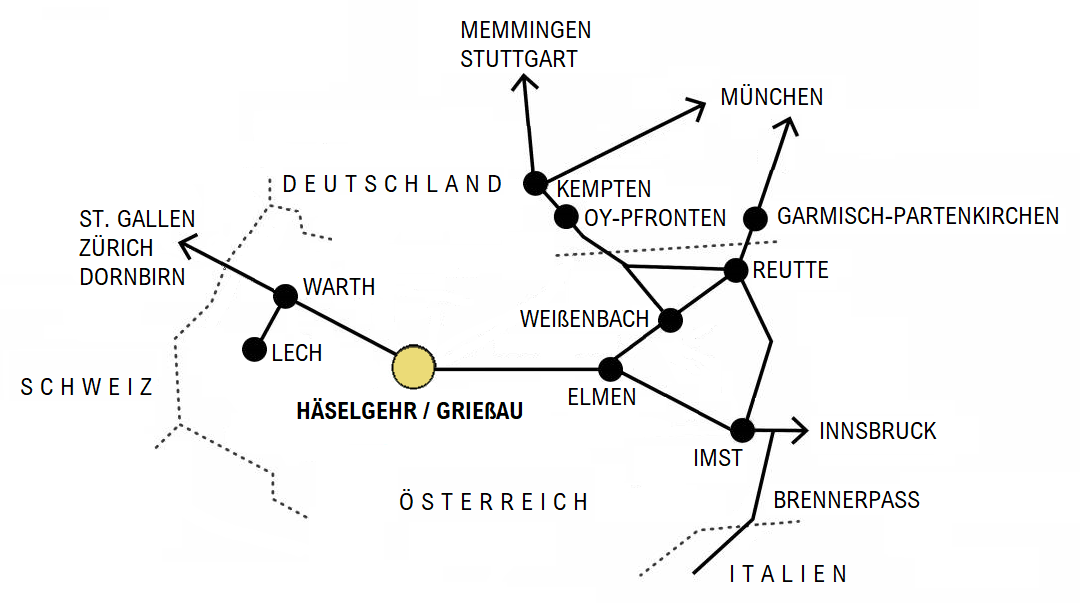 - Autobahn A7 Ulm – Kempten – Reutte; from Reutte approx. 30 min. towards LECHTAL – Warth am Arlberg.
